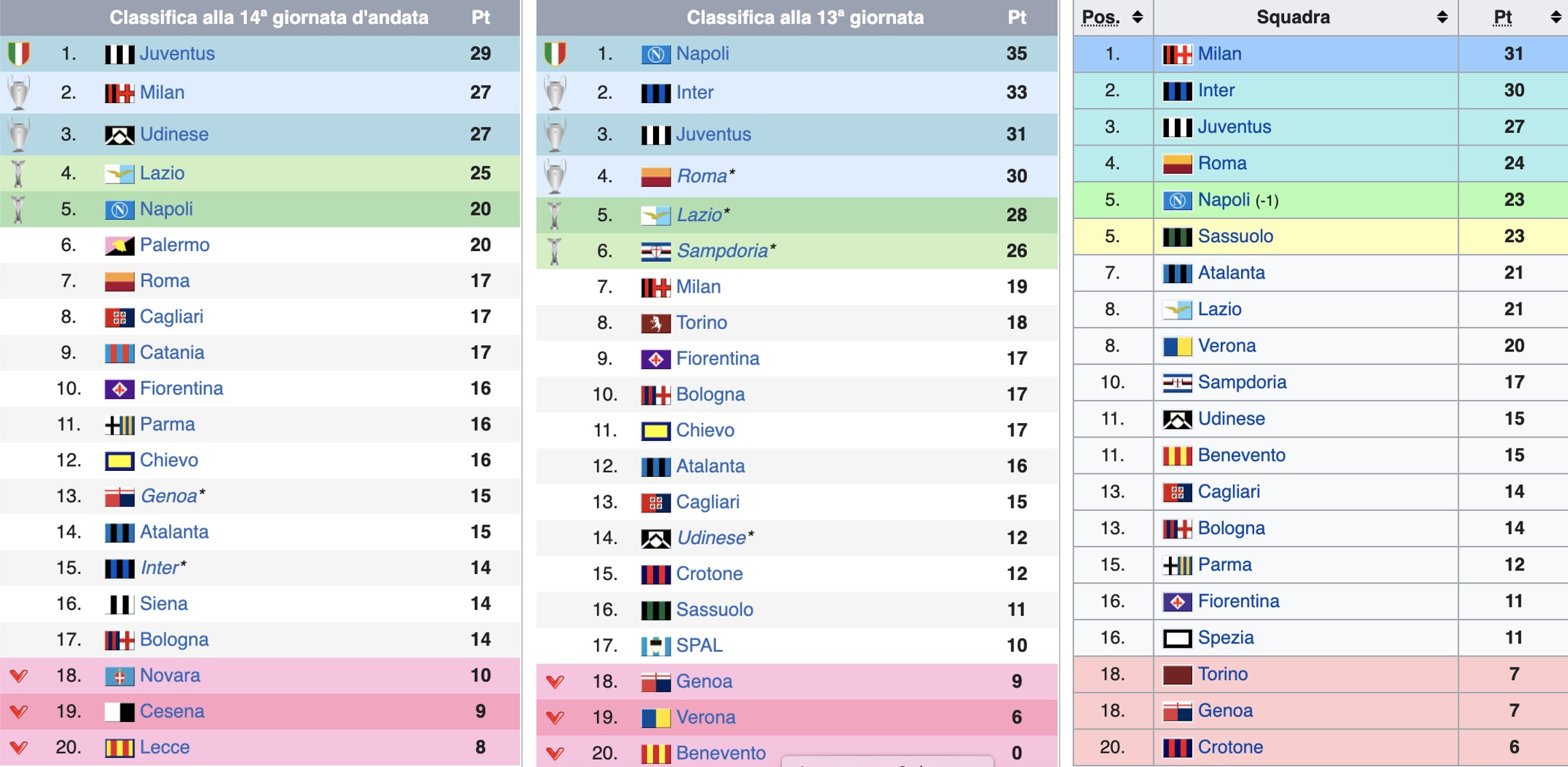 • Dopo 13 partite restano imbattute le Juventus 2011-12, 2018-19, 2019-20 e la attuale (il 40% dei casi nel campione).