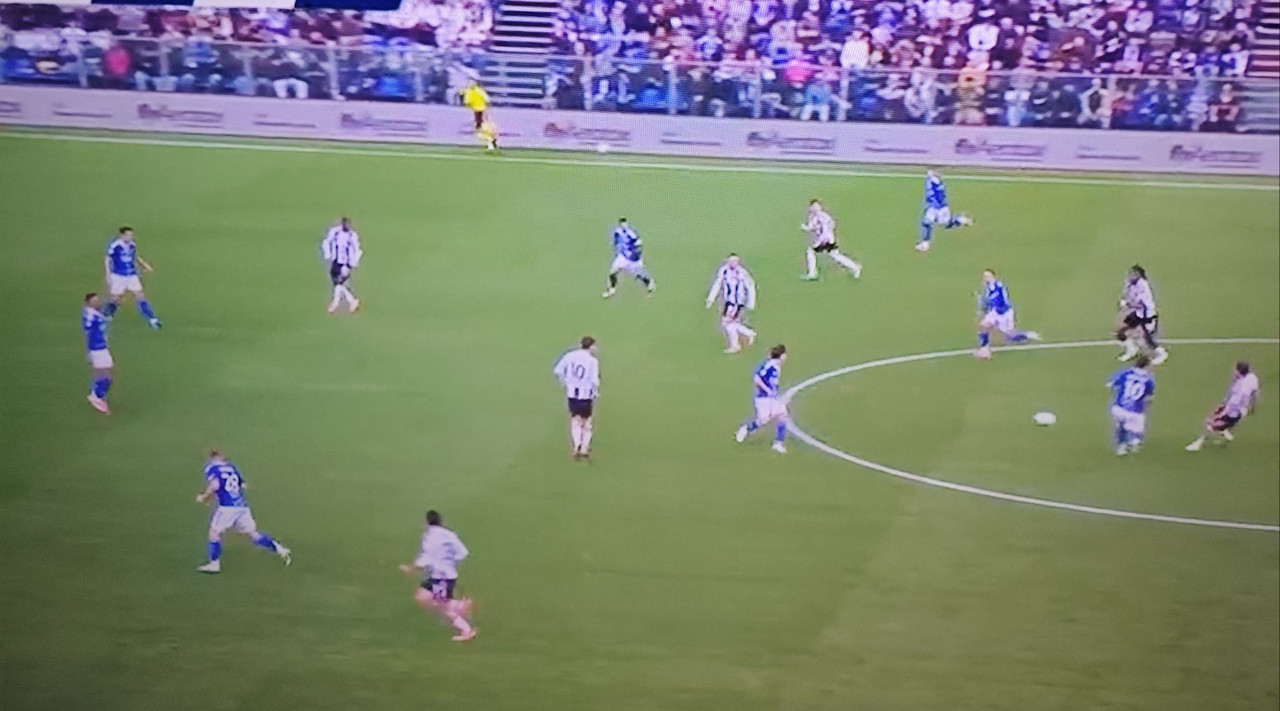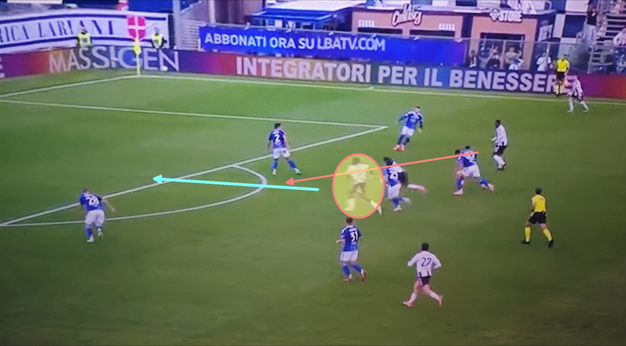 Tutto sommato, l’uscita esterna è il minore dei mali perché se il pressing non è aggressivo, non prende i riferimenti e SOPRATTUTTO NON E’ DI SQUADRA, inclusi i difensori come suggerirebbe invece la mia firma lippiana, ecco che si crea la situazione tragica (che poi ad esempio, come vedremo, ricapiterà pure nel gol del 2-0) di una sorta di voragine fra i 6 che vengono a pressare e il resto della squadra e dunque con un solo banalissimo passaggio verticale il Como salta la nostra pressione, manda al bar ben 6 giocatori dei nostri (cioè il 60% dei nostri uomini di movimento!!) e può risalire subito il campo velocemente e fronte alla porta. Il pressing è così. Se lo fai bene è un’arma micidiale. Se invece lo fai male, diventa semmai un boomerang micidiale…