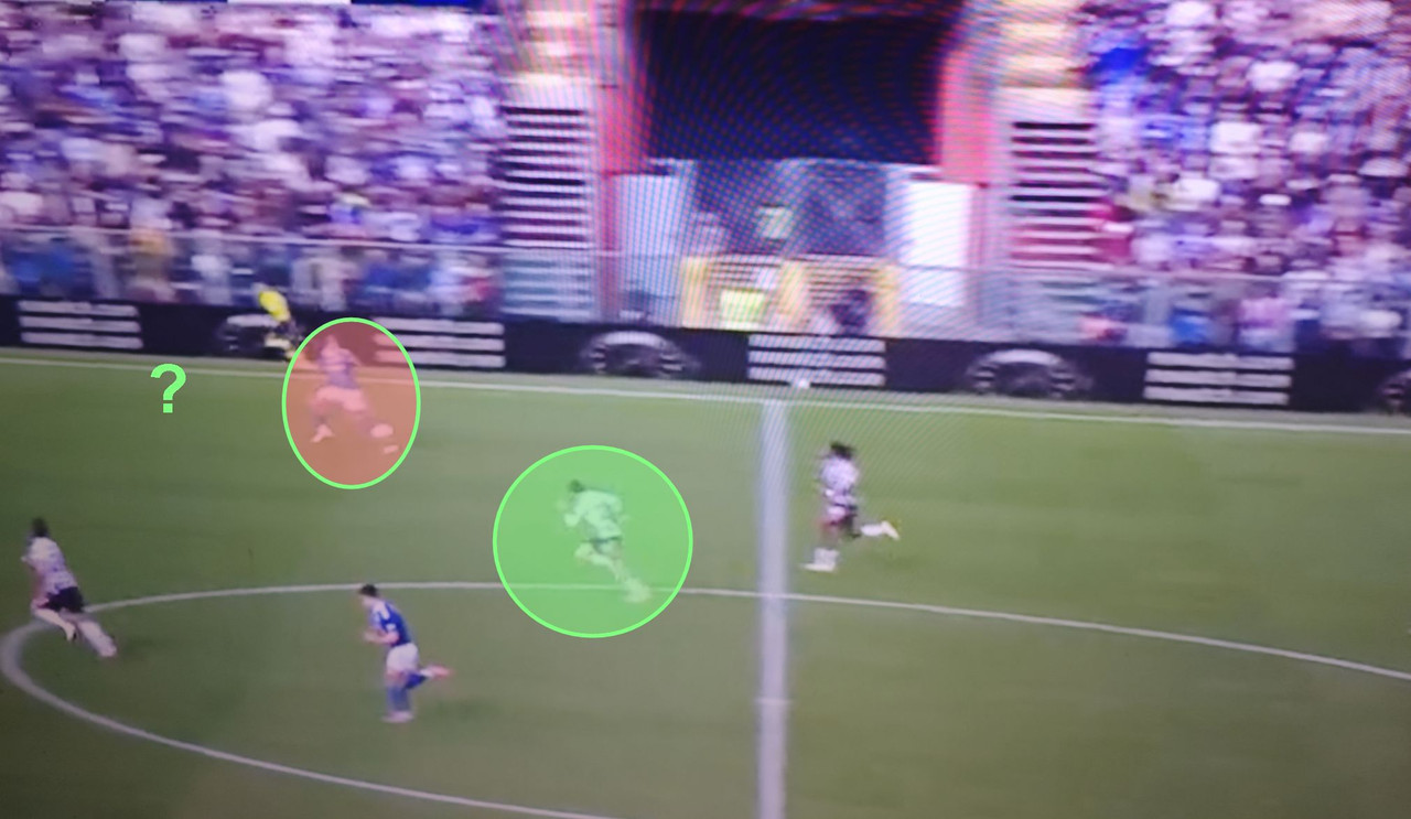 Qui vediamo come sostanzialmente si siano create le coppie in area di rigore e, a conferma che anche creando le coppie, piuttosto che a zona, siano in realtà fondamentali l’attenzione, l’abitudine, ecc.. più della scelta del tipo di castello che si vuole costruire, si nota come Kalulu, nonostante non abbia un uomo e siano già “tutti presi”, guardi la palla, stringa troppo e non cerchi né con lo sguardo, né tanto meno col movimento, l’uomo che lo attacca alle spalle. Questo stringere troppo dei nostri difensori in zona traffico lo avevamo già visto al mondiale per club nel gol di Doku (e lì non fu su azione da fermo..) e lo avevamo visto anche nello schiacciamento dei mediani nei tanti tiri da fuori lasciati contro Dortmund e inperd. Di fatto son tutte situazioni diverse (calcio piazzato, azione manovrata, tiri da fuori) ma concettualmente l’errore di “schiacciamento” è sempre il medesimo.