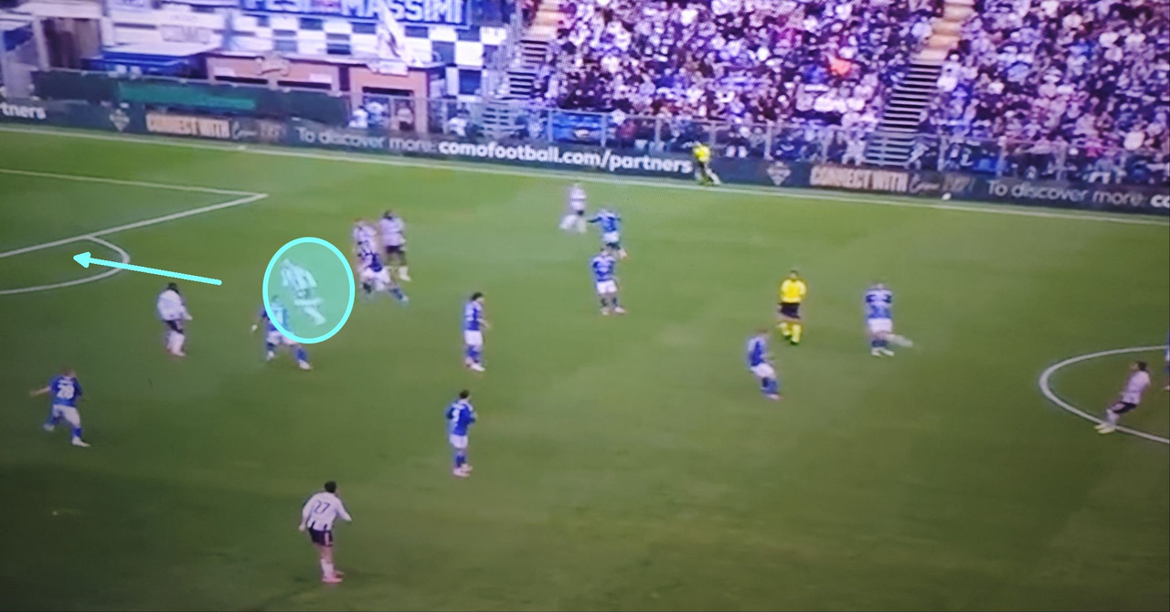 Così facendo il Como ha la facile uscita sull’esterno e poi riparte, anche perché loro lo scarico esterno ce l’hanno sempre, non avendo loro degli uomini di fascia che scorrazzano a random per il campo ma, banalmente, degli esterni che di lavoro fanno gli esterni..