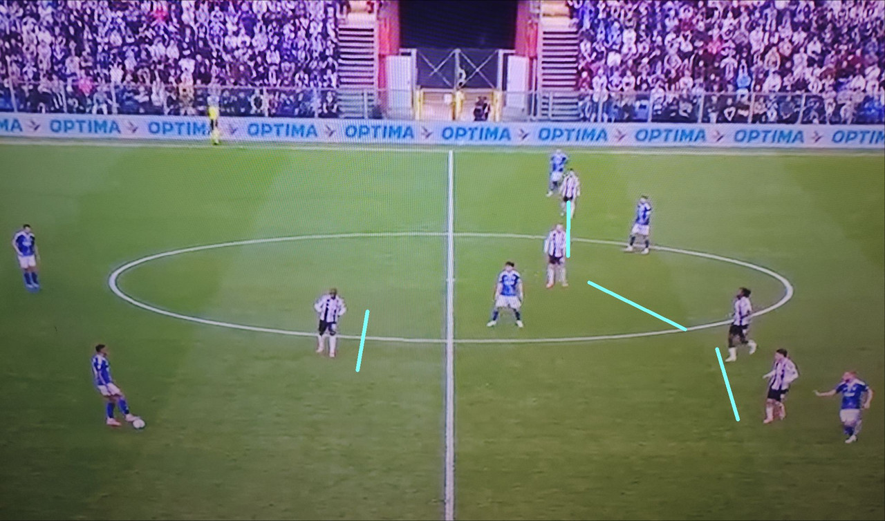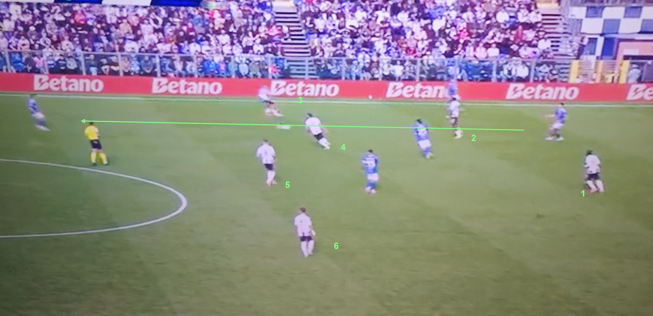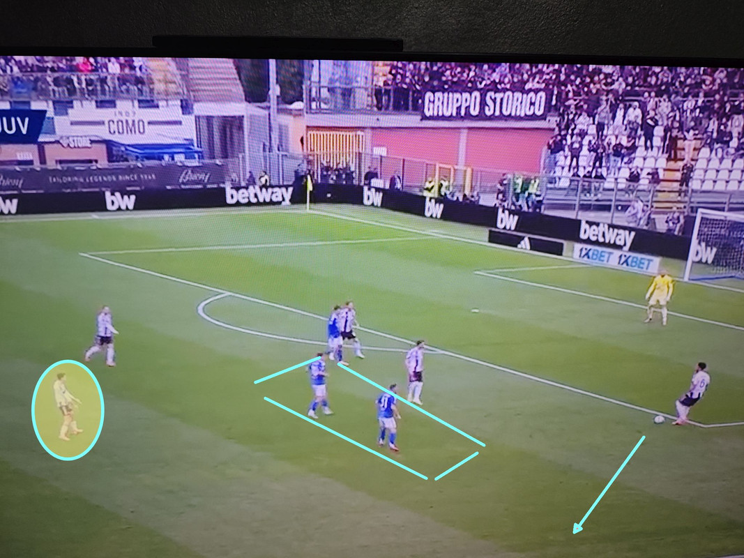 Tutto sommato, l’uscita esterna è il minore dei mali perché se il pressing non è aggressivo, non prende i riferimenti e SOPRATTUTTO NON E’ DI SQUADRA, inclusi i difensori come suggerirebbe invece la mia firma lippiana, ecco che si crea la situazione tragica (che poi ad esempio, come vedremo, ricapiterà pure nel gol del 2-0) di una sorta di voragine fra i 6 che vengono a pressare e il resto della squadra e dunque con un solo banalissimo passaggio verticale il Como salta la nostra pressione, manda al bar ben 6 giocatori dei nostri (cioè il 60% dei nostri uomini di movimento!!) e può risalire subito il campo velocemente e fronte alla porta. Il pressing è così. Se lo fai bene è un’arma micidiale. Se invece lo fai male, diventa semmai un boomerang micidiale…