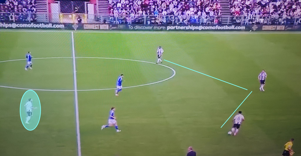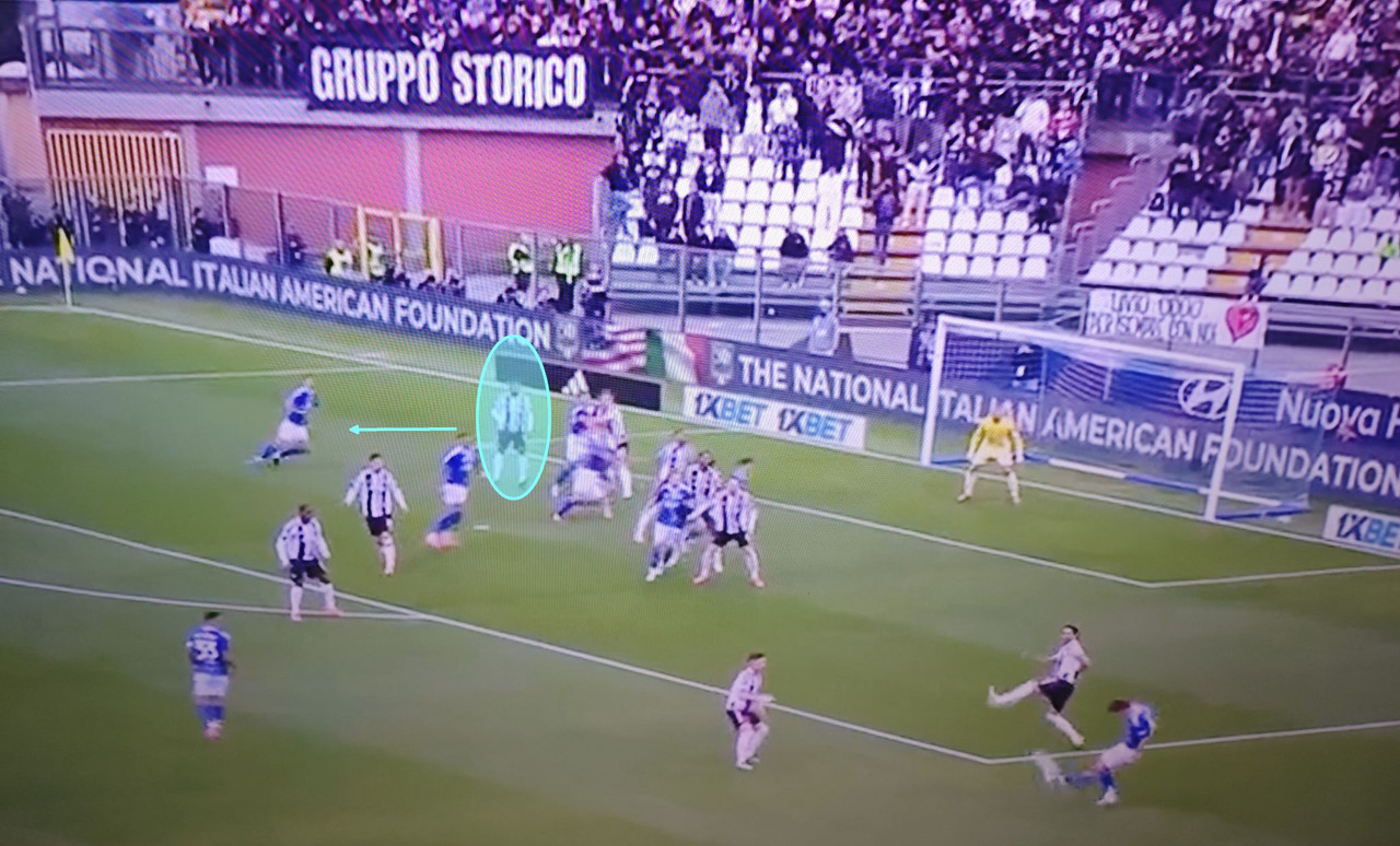 Qui andiamo di male in peggio.. non solo Cambiaso non consente lo scarico del terzino e fa di nuovo il “regista non necessario”, ma non si rende neanche conto di essere schermato da ben due giocatori del Como (nel riquadro). Nonostante questo, non si apre e anzi allarga le braccia verso Kelly come a dire “ehi, perché non me la passi?”.. il che chiaramente manderebbe in porta mezzo Como.. e dunque…
