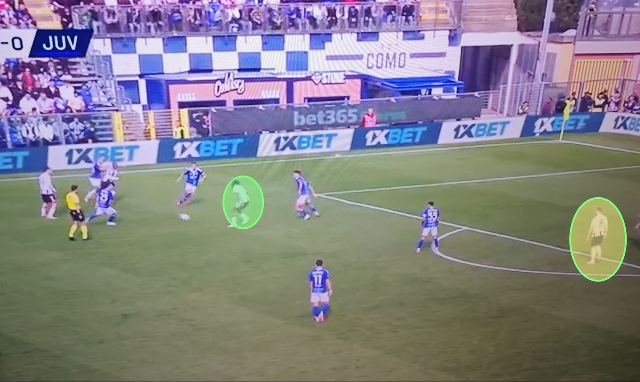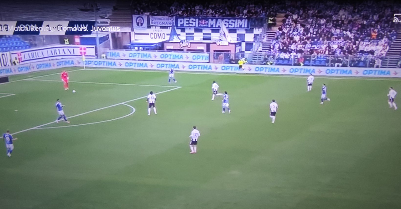 Anche qui ad esempio, nella palla gol probabilmente più pulita che abbiamo avuto con Thuram che calcerà praticamente dal dischetto del rigore mettendo fuori di pochissimo, vediamo di nuovo la linea del Como troppo statica, che non fa l’elastico e dunque con un passaggio anche piuttosto semplice, Kalulu mette praticamente in porta Thuram che, appunto, aveva attaccato quello spazio.