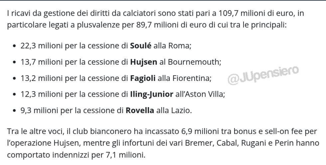 Tra le altre voci, il club bianconero ha incassato 6,9 milioni tra bonus e sell-on fee per l’operazione Hujsen, mentre gli infortuni dei vari Bremer, Cabal, Rugani e Perin hanno comportato indennizzi per 7,1 milioni.