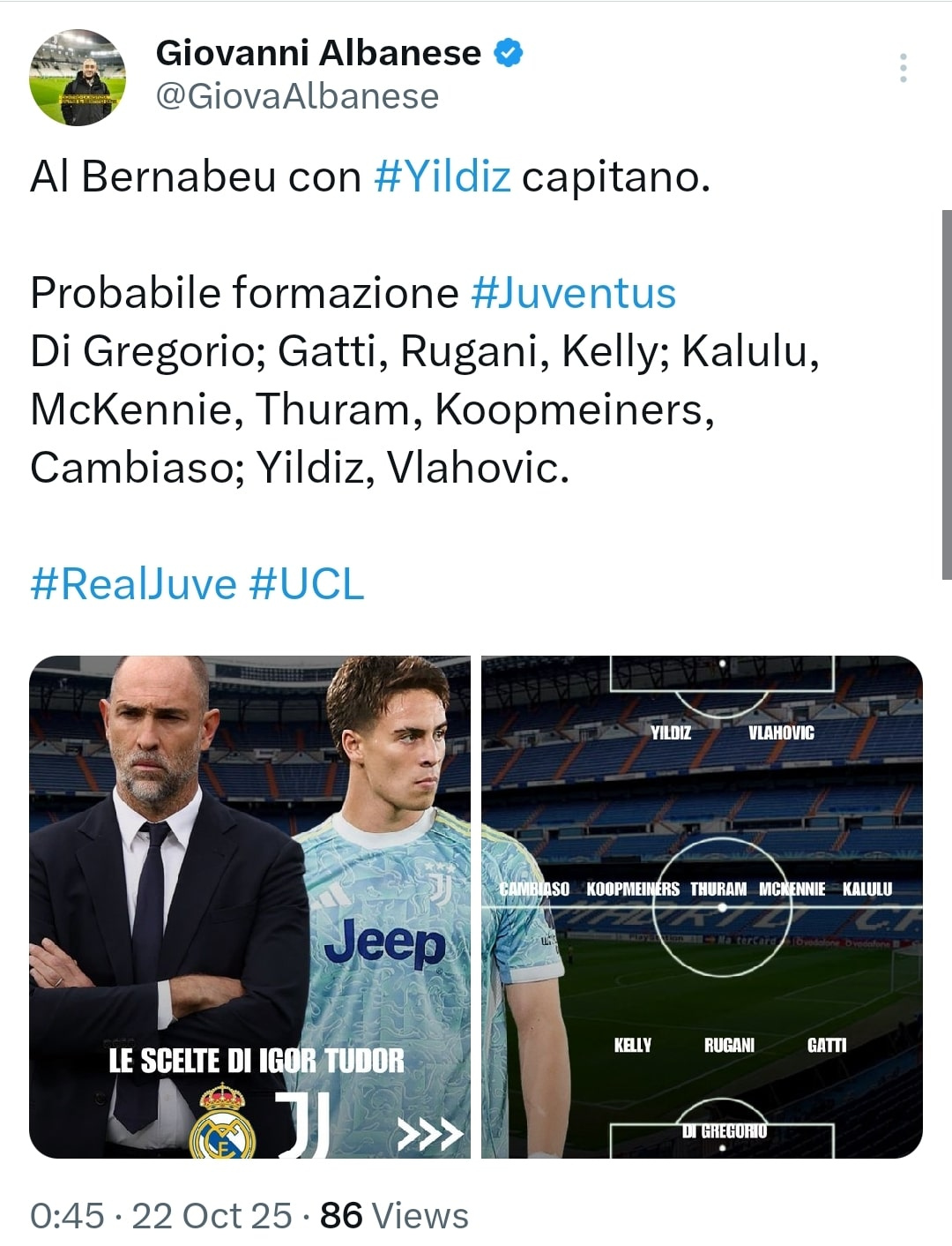 Domani giornata storica per yldiz, sarà il capitano della Juve al bernabeu