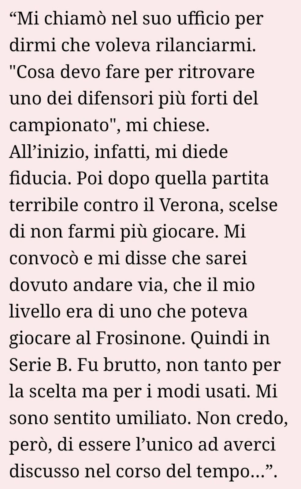 “Mi chiamò nel suo ufficio per dirmi che voleva rilanciarmi. "Cosa devo fare per ritrovare uno dei difensori più forti del campionato", mi chiese. All’inizio, infatti, mi diede fiducia. Poi dopo quella partita terribile contro il Verona, scelse di non farmi più giocare. Mi convocò e mi disse che sarei dovuto andare via, che il mio livello era di uno che poteva giocare al Frosinone. Quindi in Serie B. Fu brutto, non tanto per la scelta ma per i modi usati. Mi sono sentito umiliato. Non credo, però, di essere l’unico ad averci discusso nel corso del tempo…”.