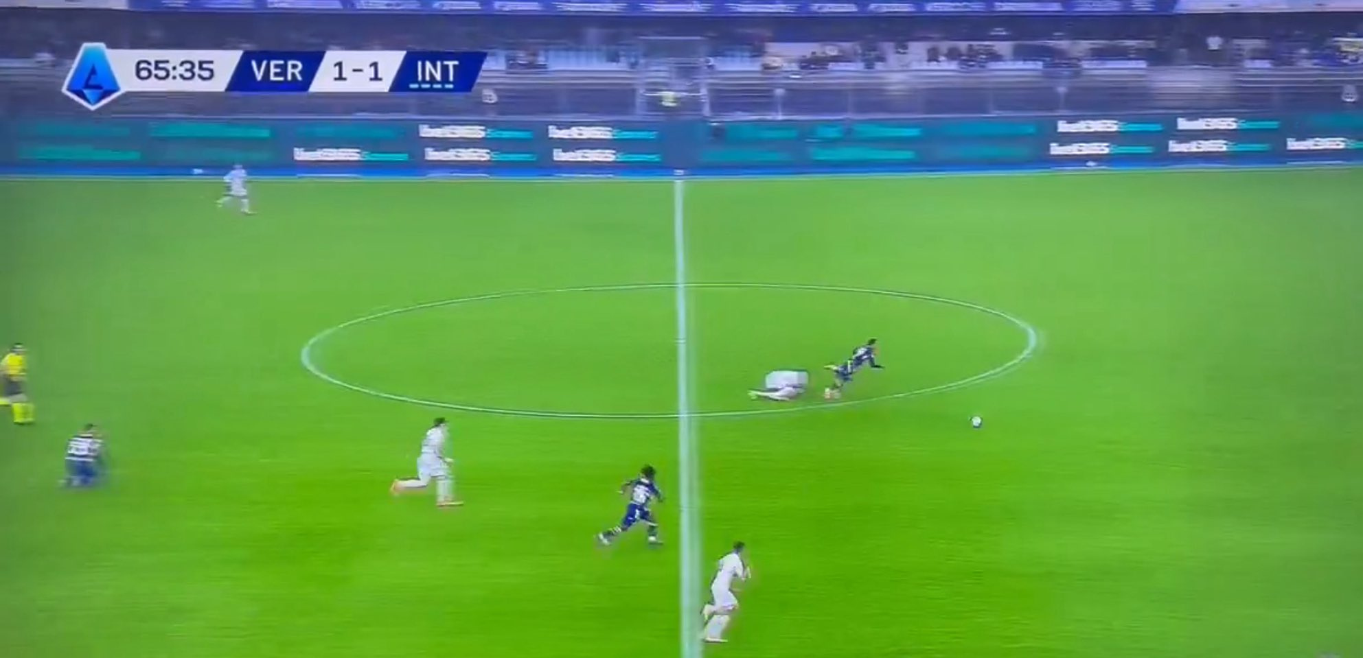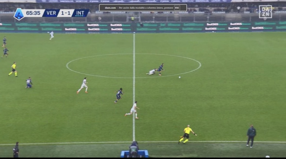 Doveri e VAR da radiare questa sera stessa. Errore a dir poco gravissimo ritenere che in quella situazione l'azione si stesse spostando verso la fascia. Lì il calciatore del Verona sta andando dritto verso la porta e sposta il pallone un millisecondo prima di farsi buttare giù dal prescritto, per cui in quella situazione la direzione dell'azione è quella che centrale che va verso la porta di Sommer.
