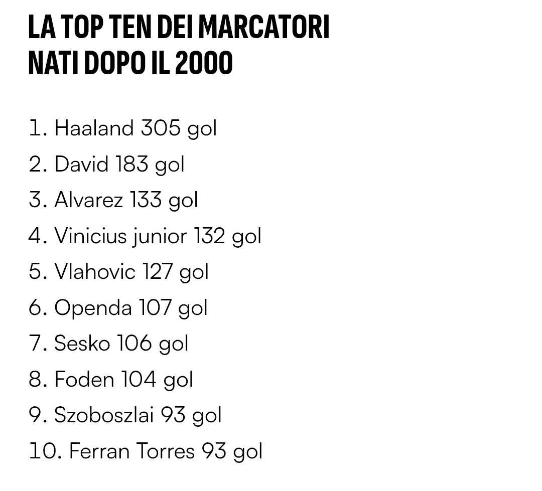 Poi se vogliamo rimanere alla classifica che hai citato, noi abbiamo david che è il secondo e openda che è subito dietro a vlahovic... quindi dovremmo essere a posto no? quei 8 milioni li possiamo destinare a un centrocampista forte.