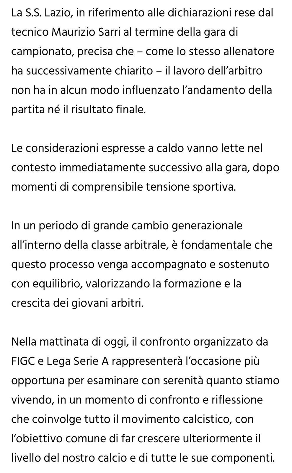 Avete visto che la Lazio ha preso le distanze dalle parole di Sarri sugli episodi arbitrali?