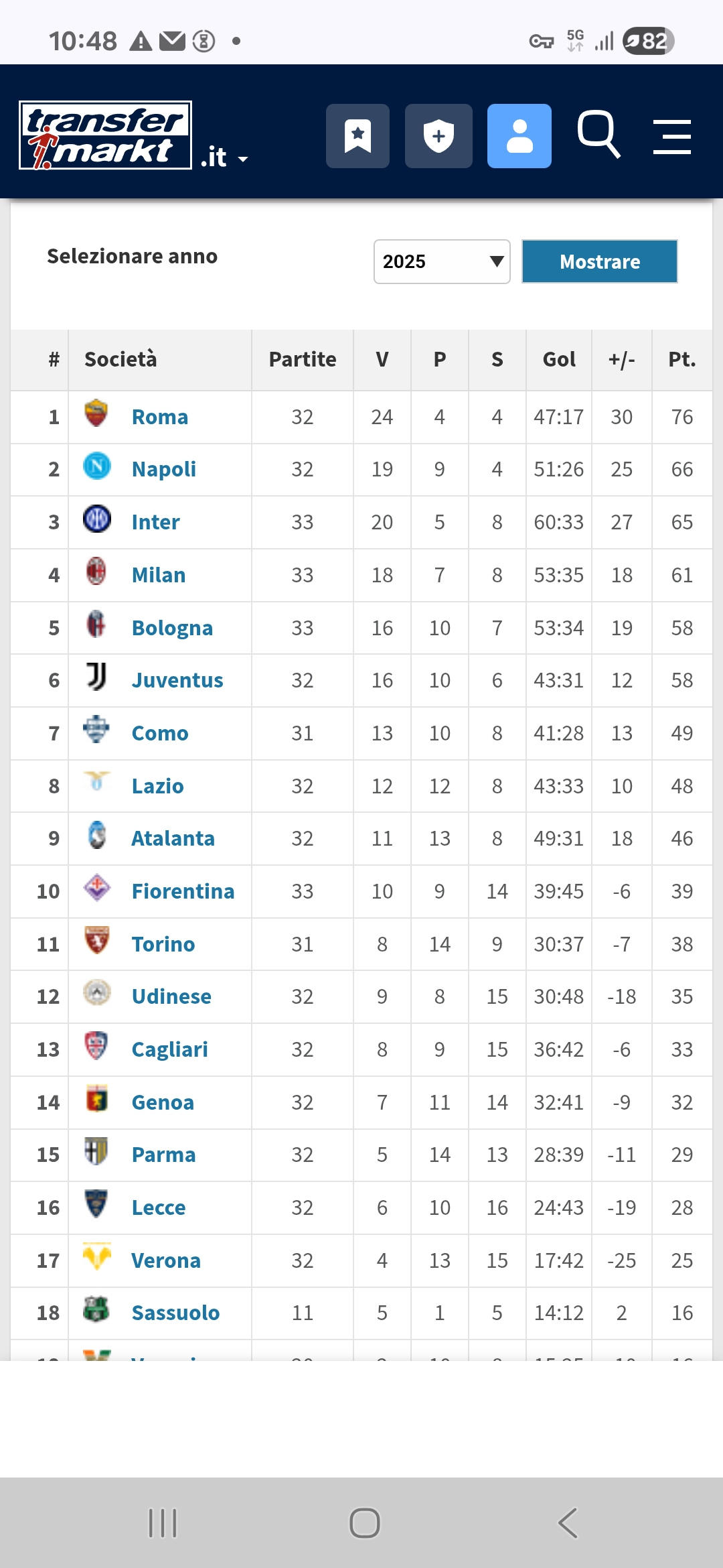È dall´estate che in molti (me incluso) sostengono che tre posti Champions sono giá assegnati a Napoli, Inter e Milan. Il quarto se lo giocheranno probabilmente Juve e Roma. E purtroppo la Roma sta overperformando; speriamo crollino alla lunga.