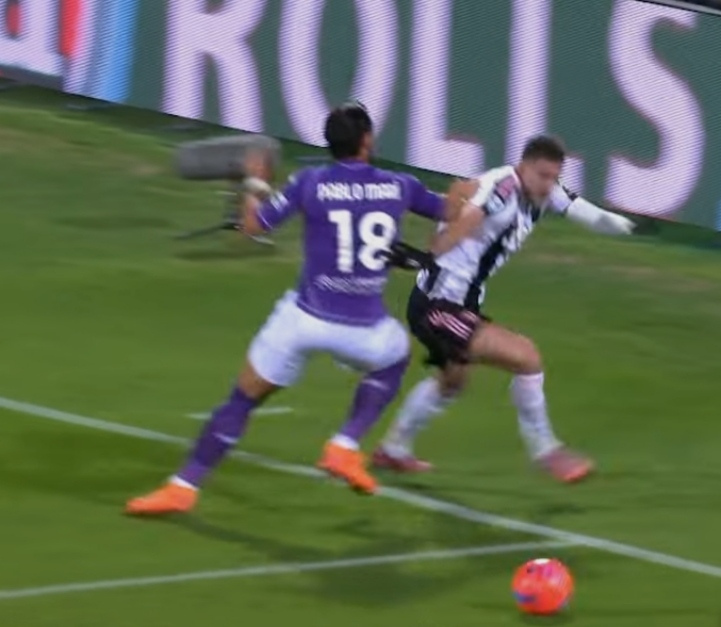 Ho messo le immagini QUAZZO, si vede benissimo che Vlahovic appena entra in area afferra con la mano destra la maglia di quello della Fiorentina e lo tira verso il basso e poi si butta.
