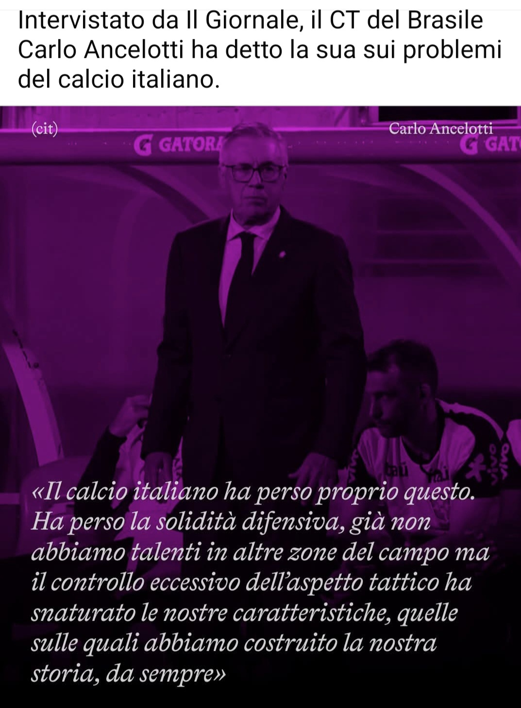Ancelotti dice le stesse cose: 'il calcio italiano ha perso la solidità difensiva. Già non abbiamo talenti in altre zone del campo, ma il controllo eccessivo dell' aspetto tattico ha snaturato le nostre caratteristiche... o recuperiamo i difensori o meglio la mentalità difensiva che ci ha garantito vittorie di club e nazionale o continueremo a soffrire, perché il calcio è si fare un gol in più dell' avversario, ma anche prenderne uno in meno'.